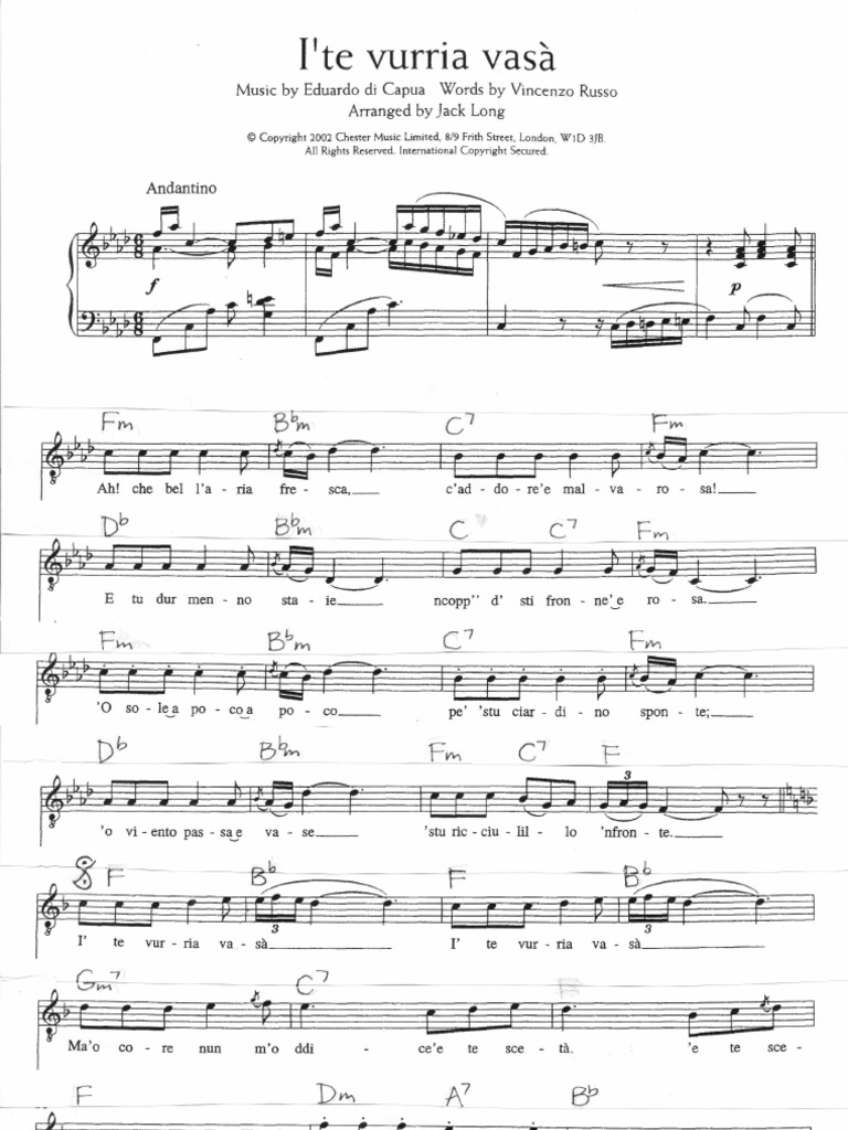 'о viento пасса е васа stu ricciulillo 'nfronte! Ma 'o core nun mmo ddice 'e te scetá. I' te vurria vasà… il testo contenuto in questa pagina è di proprietà dell'autore. 'o sole a poco a poco pe 'stu ciardino sponta;